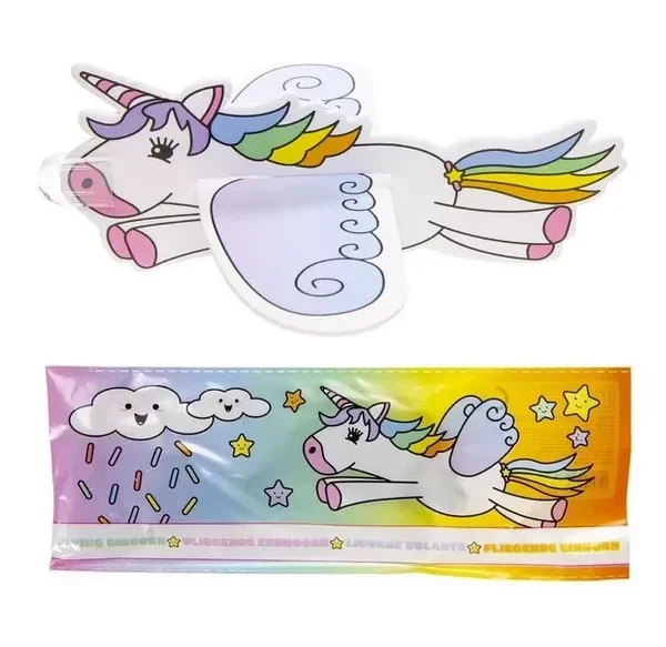 Schuif de delen in elkaar en gooi de unicorn in de lucht om hem te laten vliegen. Heel erg leuk om te gebruiken bij een traktatie