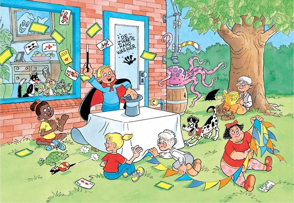 Een vrolijke junior puzzel van Jan van Haasteren met als titel de Goochelaar. De Goochelaar weet wel heel veel uit de hoge hoed te toveren!