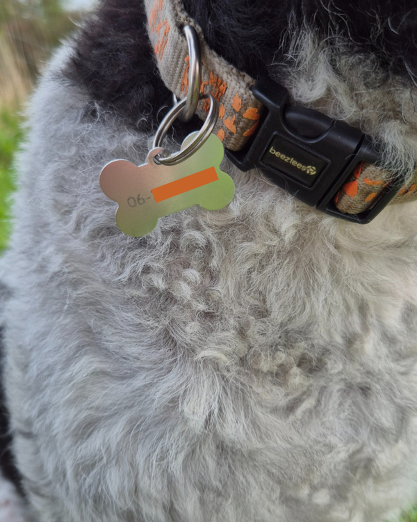 Een mooie hondenpenning met naam.Op de achterkant kan je een telefoonnummer laten graveren(optioneel) Of een andere tekst zoals een adres.